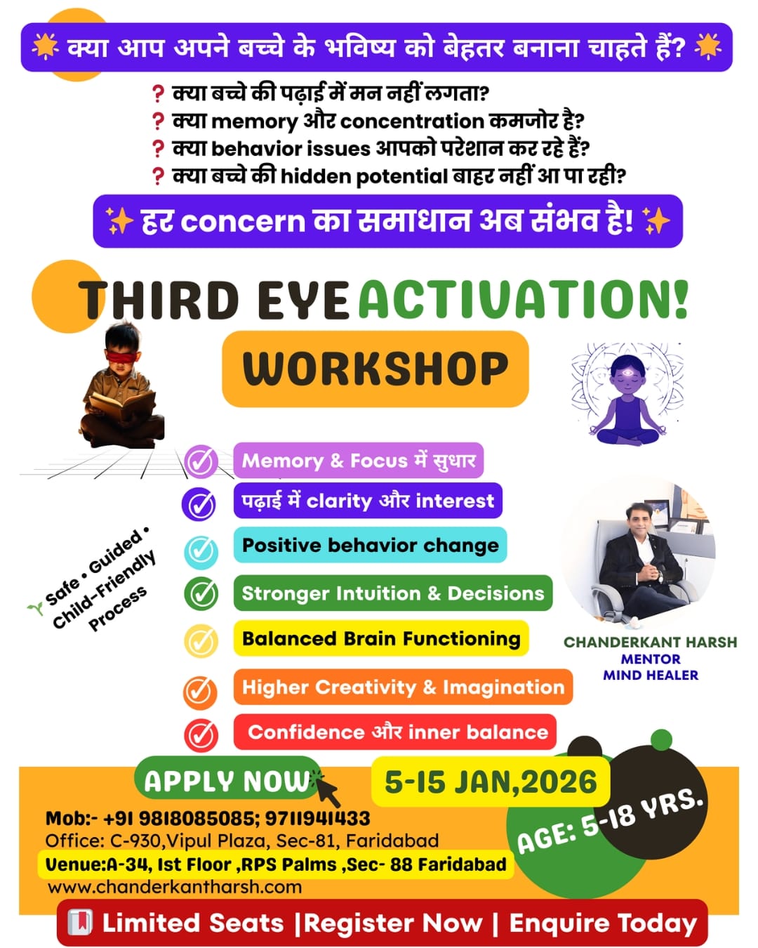 The workshop will be conducted in Faridabad from 2nd January to 15th January 2026 by renowned Mind Healer Chanderkant Harsh. Through fun, age-appropriate activities, guided meditation, visualization, breathing techniques, and interactive exercises, children will learn to improve focus, intuition, emotional balance, confidence, and mental clarity in a safe and nurturing environment.